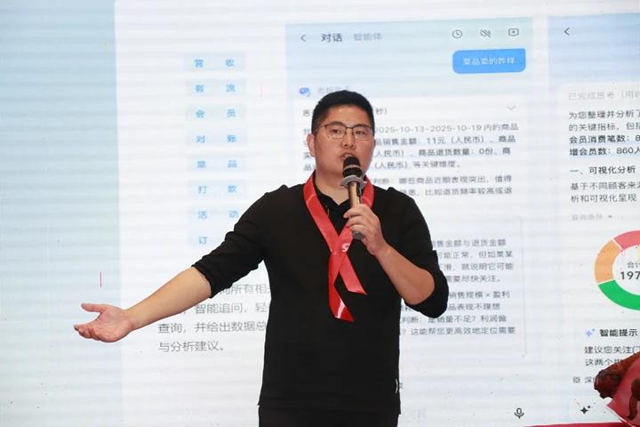 会上,客如云&美味不用等副总裁侯立民发表主旨演讲,深入剖析了AI时代下餐饮行业的数字化新趋势,并现场展示了前沿的AI落地方案,引得与会嘉宾深度共鸣。